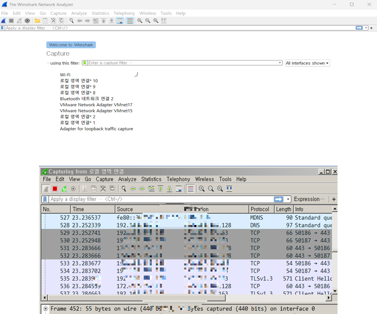 - 앞서 본 Process Monitor 와 마찬가지로 상당히 짧은 시간에 많은 패킷이 지나가기 때문에 필터 기능을 잘 활용해서 사용 해야 합니다.