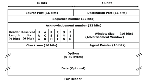 TCP 헤더의 경우 일반적으로 여러개의 필드로 이루어진 20Bytes 크기의 헤더를 사용한다.