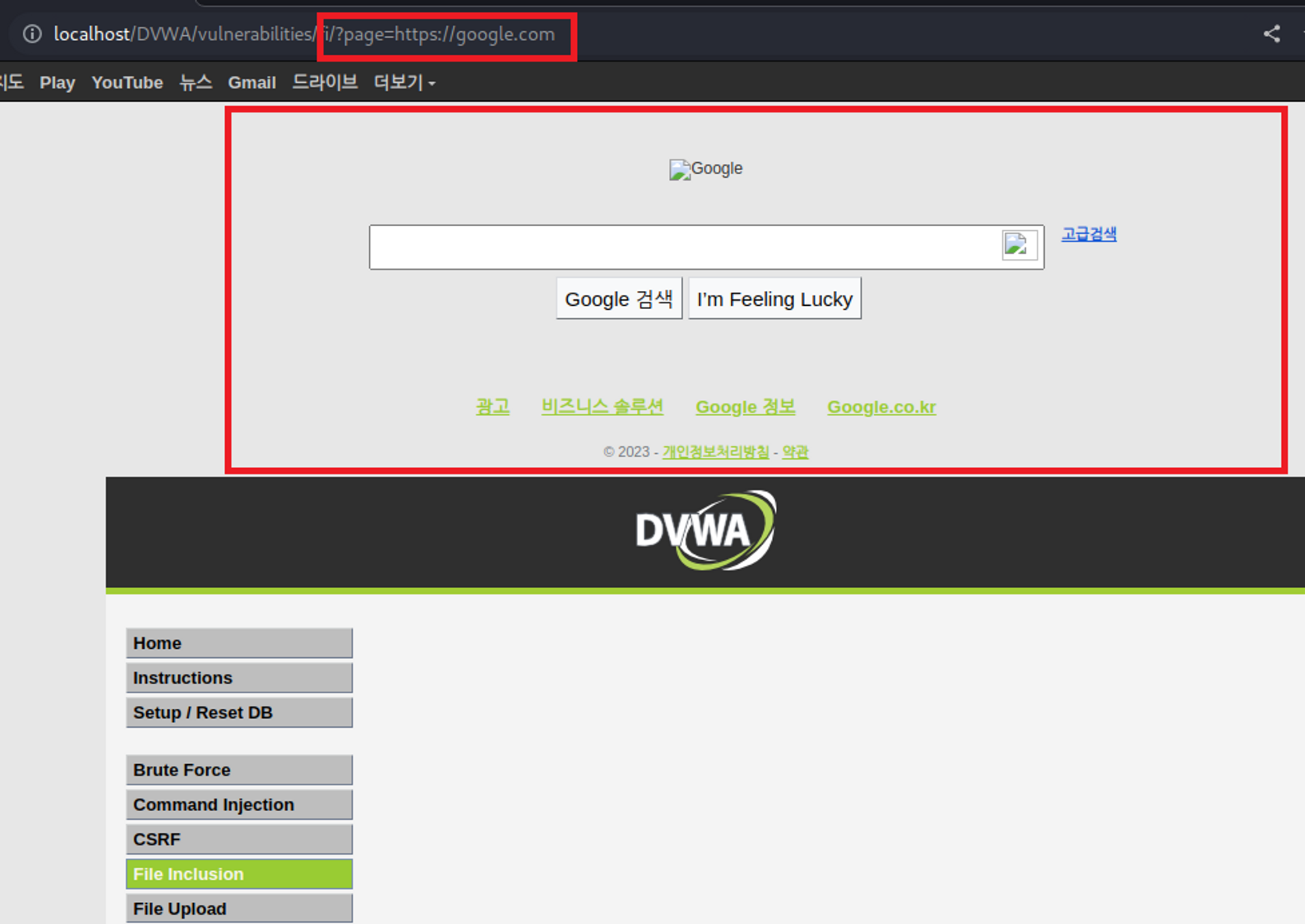- 또한, 해당 page 파라미터에 google URL을 입력하여 RFI 공격을 시도해본 결과 google 웹 페이지가 include 되어 해당 페이지서 출력되어 지는 모습도 확인할 수 있었다.