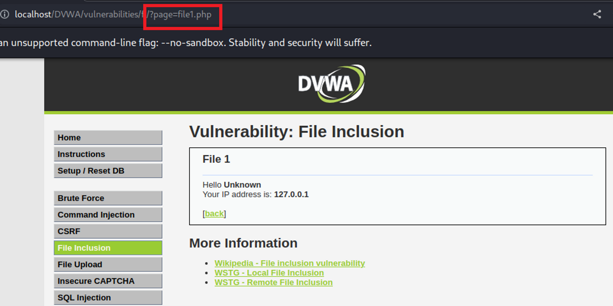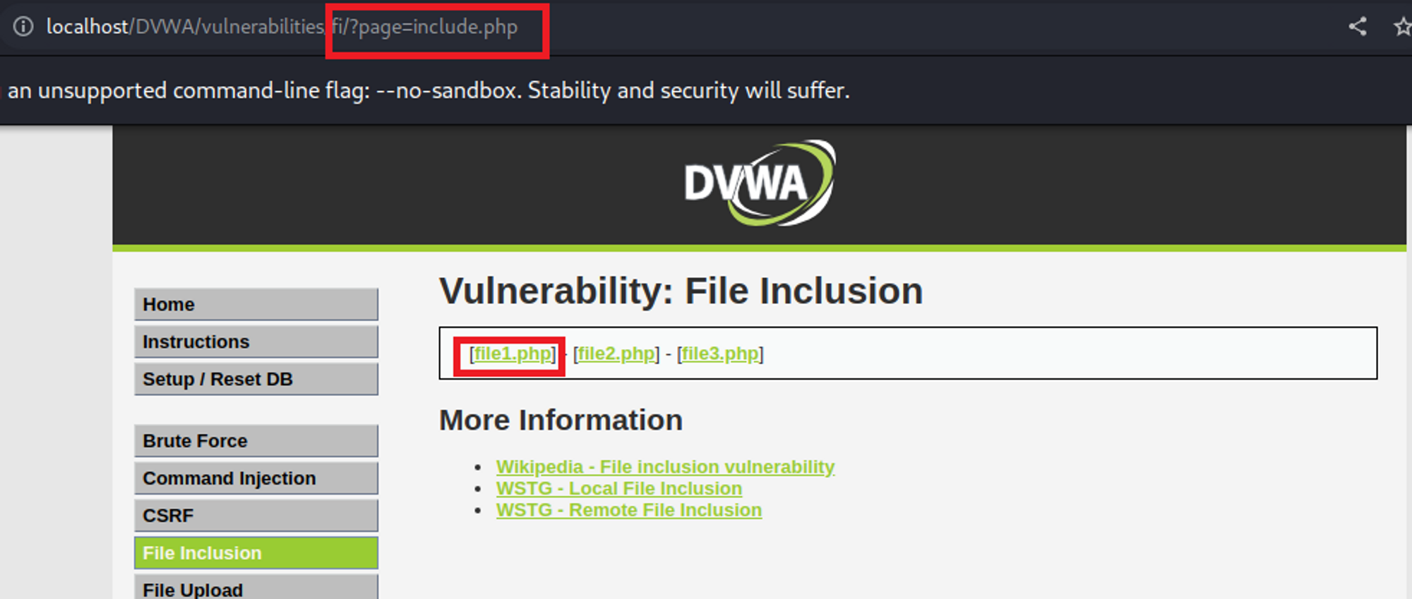 DVWA 환경에서 File Inclusion 탭에 들어온 모습