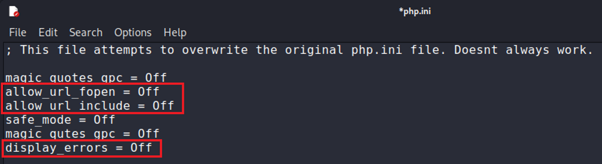 - file inclusion 공격이 많이 발생되는 애플리케이션인 php를 기준으로 php.ini 파일에서 allow_url_fopen, allow_url_include, display_errors 설정을 모두 Off 로 설정하여 RFI 공격이 불가능 하도록 설정한다.