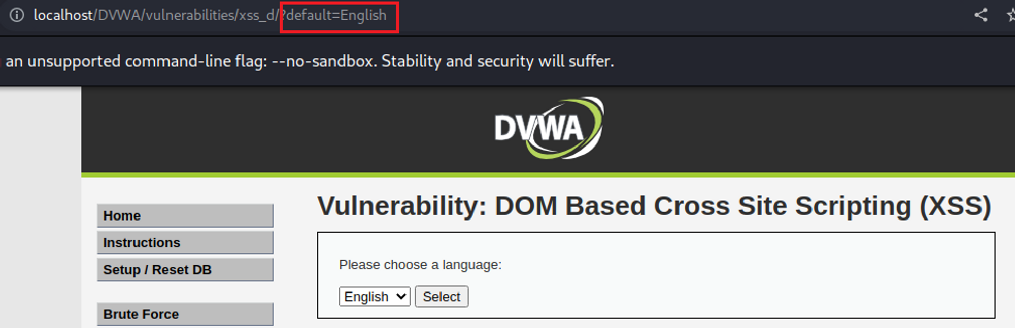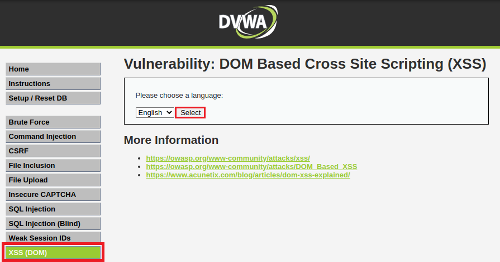 DOM Based XSS 공격 실습을 위해 DVWA 환경에서 해당 탭으로 이동한 모습이다.