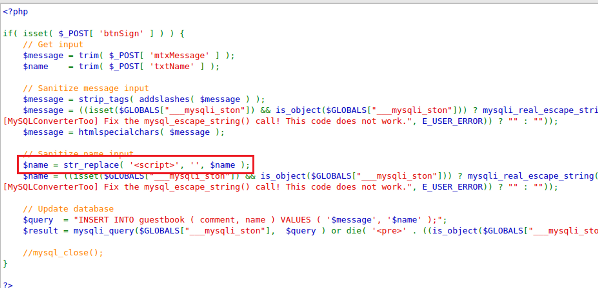 - 아래 사진은 블랙리스트 방식으로 <script> 태그가 입력될 경우 공백으로 치환되도록 구현한 것이다.