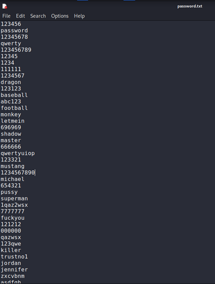 해당 패스워드 목록 파일은 실제 전 세계에서 가장 많이 사용되고 있는 패스워드를 텍스트 파일 형태로 생성해 둔 것이다.