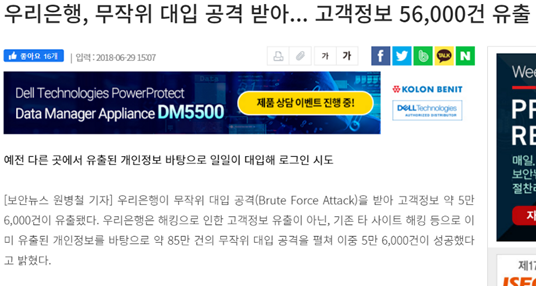 실제 최근 사례로 다른 취약한 웹 페이지에서 탈취된 개인정보를 기반으로 우리은행 웹 사이트에서 Brute Force 공격을 수행하여 약 56,000 건의 개인정보가 유출되는 등의 사건이 발생한 사례가 있다.