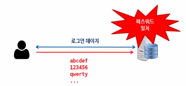 무차별 대입 공격이라고 부르는 공격 기법으로 위 그림과 같이 특정한 암호를 알아내기 위해 가능한 모든 경우의 수를 대입하여 암호를 알아내는 공격 기법을 의미한다.