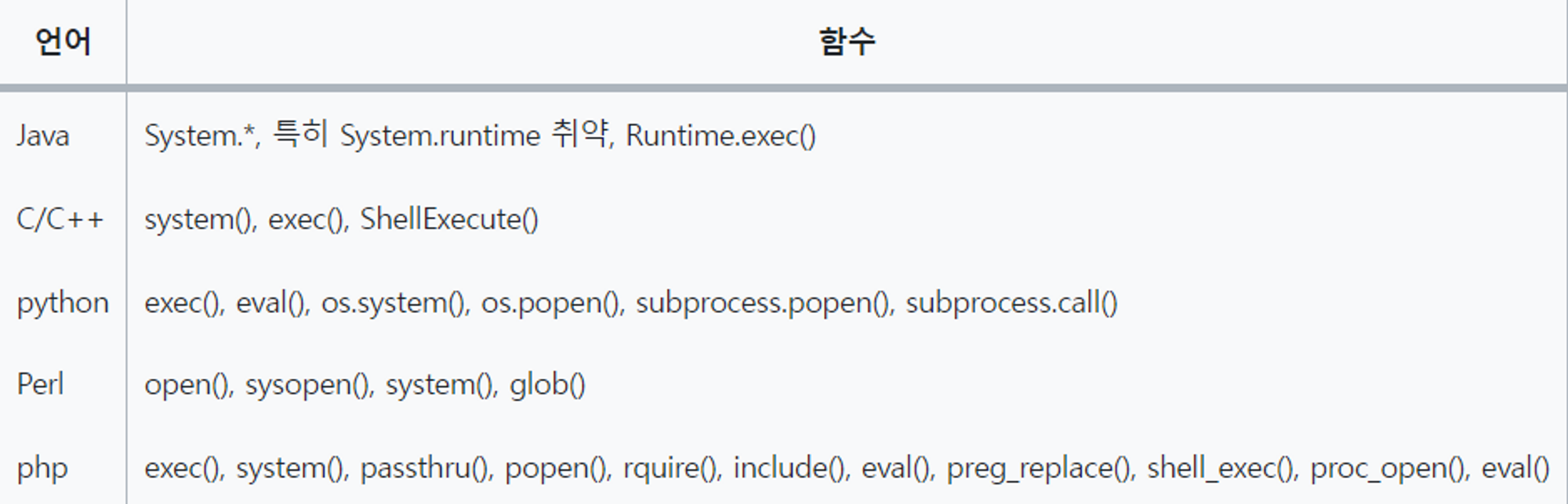 Command Injection의 경우 일반적으로 취약한 함수를 사용함으로써 취약한 환경이 만들어지기 때문에 위 사진에 보이는 함수들은 특별한 사유가 없다면 사용을 지양해야 한다.