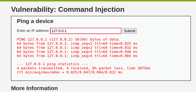 이전에 ;(세미콜론)과 &&(더블 엠퍼센트)를 입력하여 Command Injection 공격을 수행하였을 때는 Medium 레벨에서 실패하였기 때문에 다른 다중 명령어를 입력할 수 있는 특수문자를 사용하여 Command Injection 공격을 추가로 시도한 모습이다.