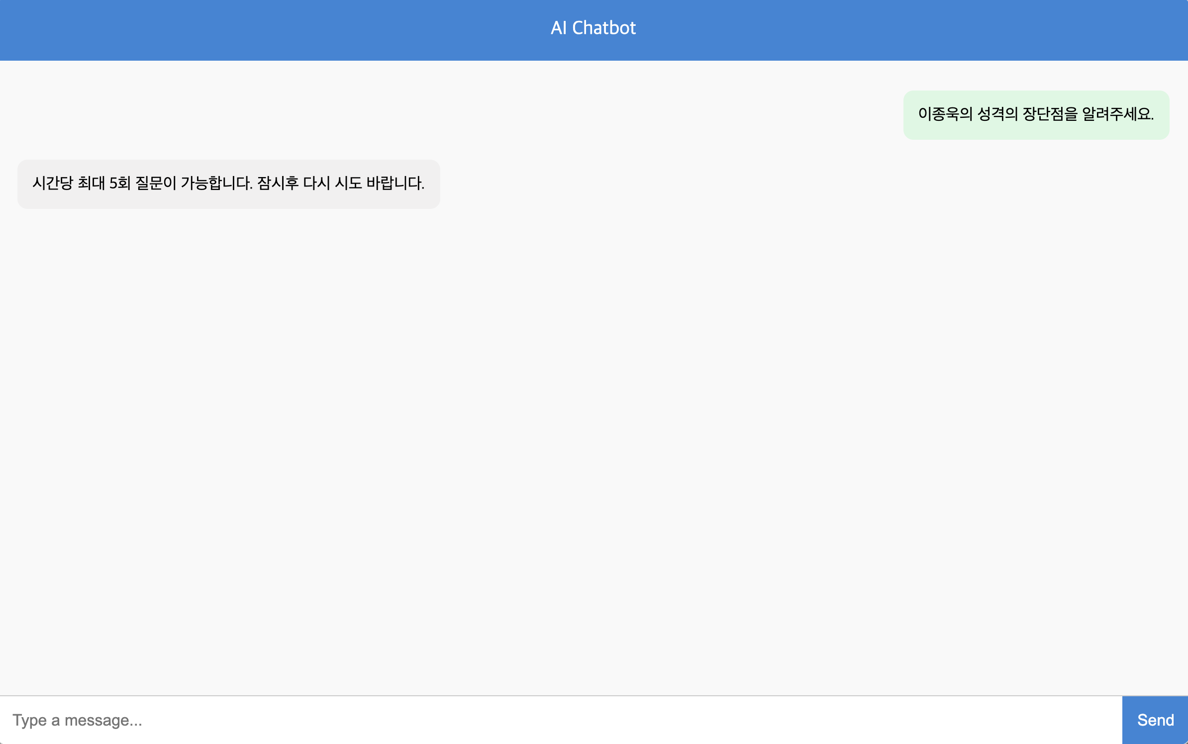 return jsonify({"response": "시간당 최대 5회 질문이 가능합니다. 잠시후 다시 시도 바랍니다."}), 429